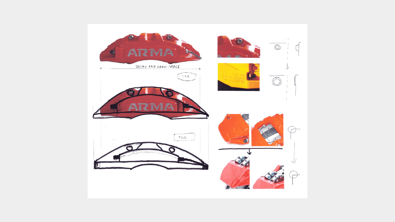 Product design of a sharp-edged, racy and sleek design was delivered despite the limitations of the alloy casting process. This was a key to segmenting two tiers of Arma products. Sharp edges for high end and dull edges for the entry-level product. The signature and characteristic trapezoid shape of the brake were then promoted to the level of branding by integration into the company logo as then used on all marketing and packaging.