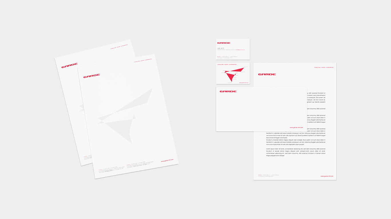 Garde received an evolution of their identity based on the existing logo and brand color. A visual system got developed. The concept is based on an abstracted map of Garde global offices. This abstract form was then applied to the identity based on the delivery of an application usage guideline. New sales brochures were then designed, produced and delivered.